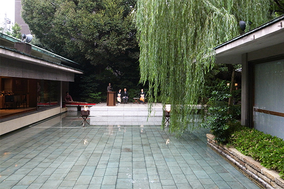 水盤と柳の使い方が斬新。当然、雨が降れば室内に変更だろうが、