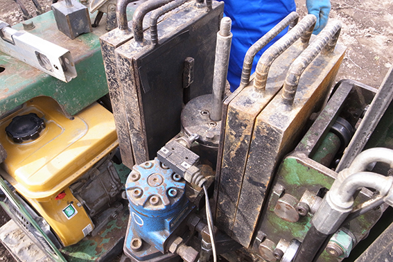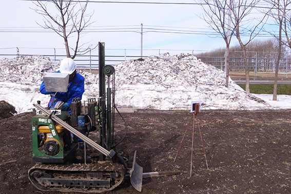 土の貫入抵抗を調べていきます。ここは泥炭層が広がっているので、