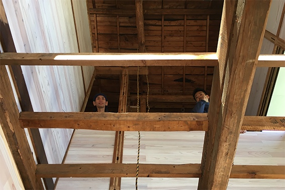 電気屋さんと確認しているところです。実際にロープを垂らして、長さを決めました。