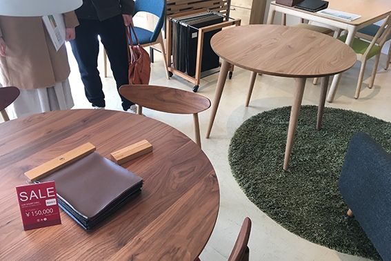 候補として写真奥は宮崎椅子製作所hozuki table、手前がkarfのオリジナル丸テーブル。