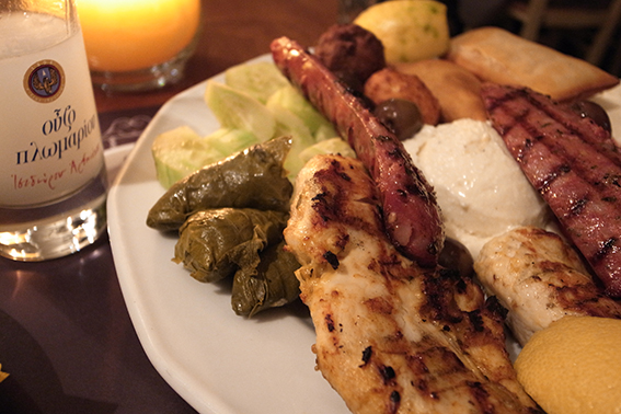 写真左はウゾという蒸留酒。ちびちび飲みつつの夕食。