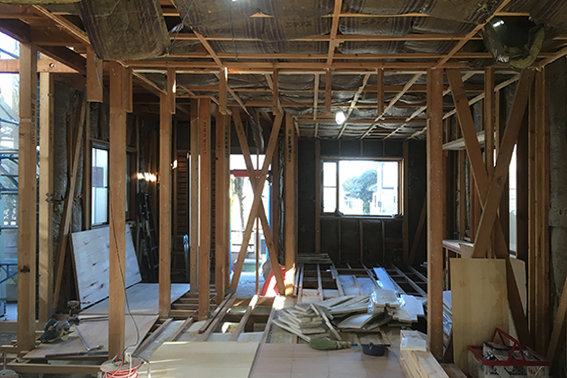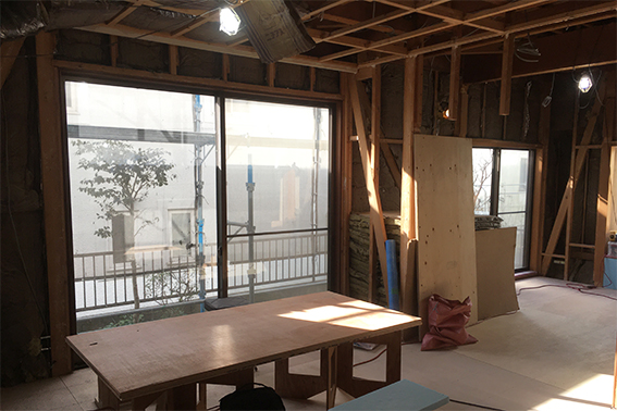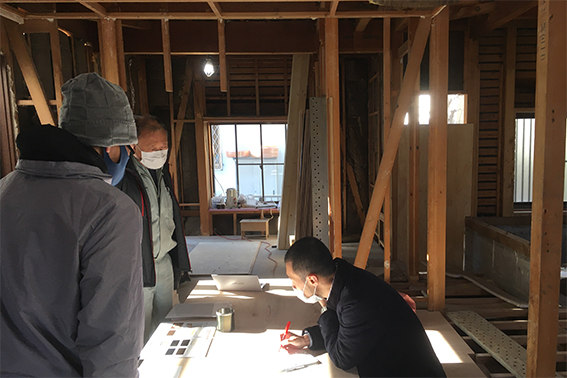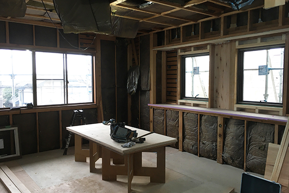 千代ヶ丘の家(戸建て住宅の改修)、12月は解体工事が進みました。今回の改修工事は室内からの工事が主ですが、一部減築を伴うので、その部分は足場や養生シートも設置されています。現れた躯体を見ながら、金物による耐震補強や減築の方法など、監督さん、大工さんとも相談しながら検討していきます。