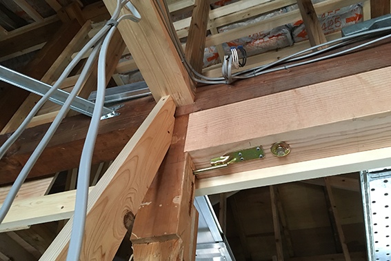 写真のように追加梁を抱き合わせる補強、羽子板ボルト、鋼製火打を取り付けています。