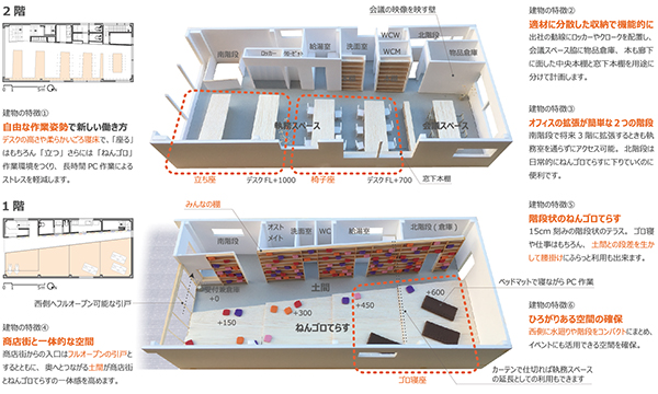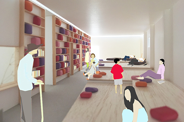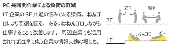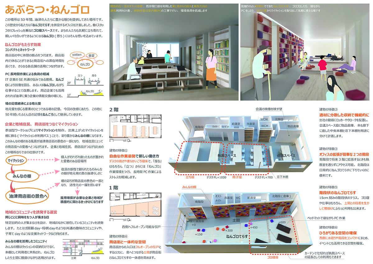 この場所は50年間、油津の人たちに豊かな眠りを提供してきた場所です。この歴史から私たちは「ねんゴロてらす」を併設するオフィスを計画しました。働くスタッフのリフレッシュを兼ねたゴロ寝スペースです。まちの人たちも気軽に立ち寄れて、親しい付合いができるようになる、ねんゴロ(懇ろ)にはそんな想いを込めています。(応募図書より)