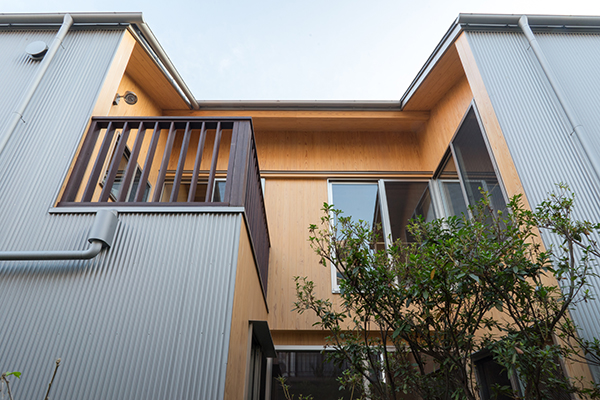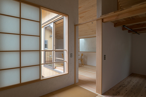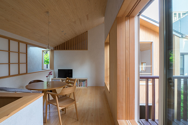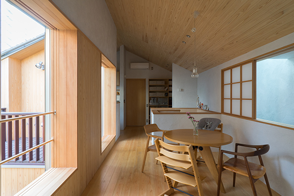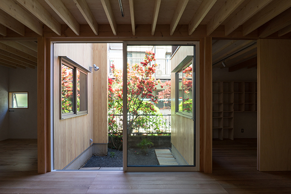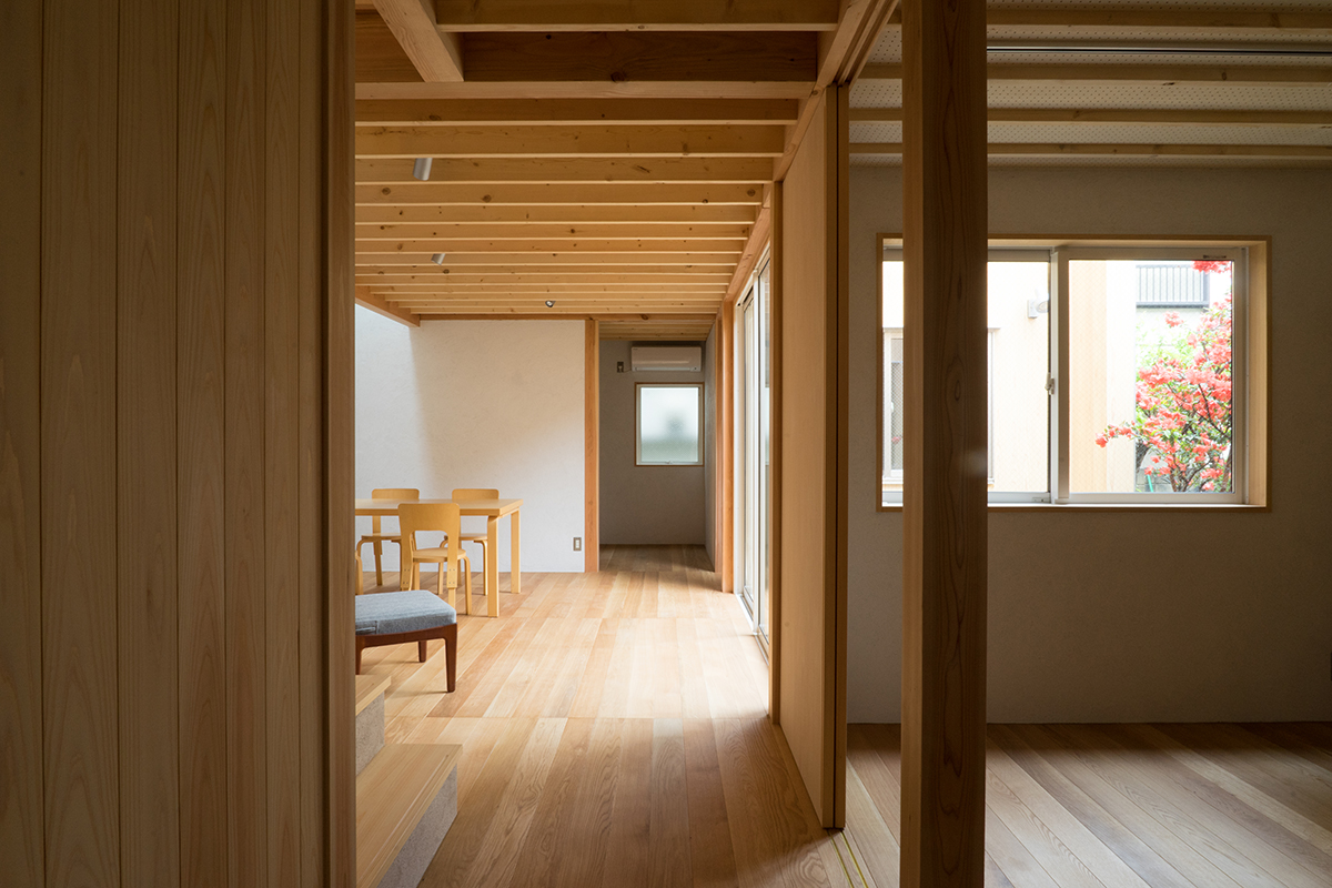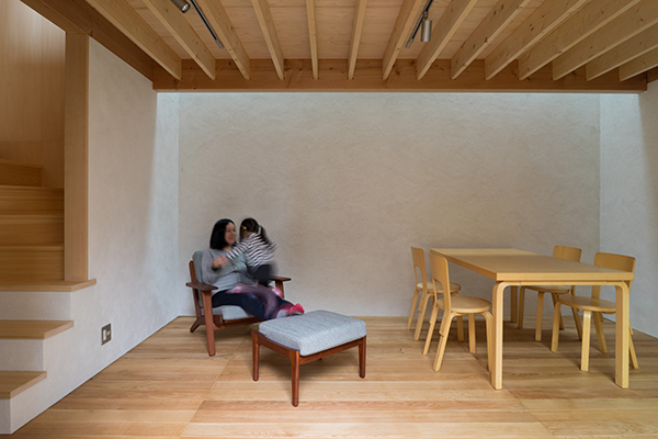 川崎市高津区の住宅地に立つ職住近接の住まいです。敷地は北向きの旗竿地で、以前からあったツツジの樹に寄りそうように計画した中庭のある住宅です。その中庭に面するようにテラスや上の間・下の間、アトリエなどを計画。中庭越しに、ほどよい距離感で立体的に繋がり、外部環境を楽しめるようにしました。上の間はプライベートなリビングダイニング、下の間は子どもの遊び場兼夫の打合せスペースです。子育てしやすいようにワンフロアでコンパクトにも暮らせます。旗竿地で重機が入れないため、人力で立てられるサイズの製材による架構としました。仕上げは無垢材や砂しっくいという自然素材で構成した長期優良住宅です。