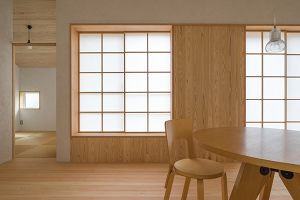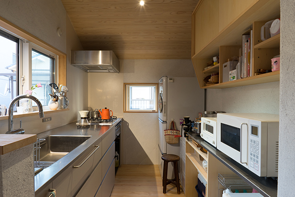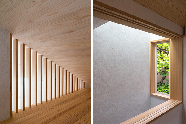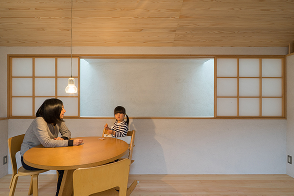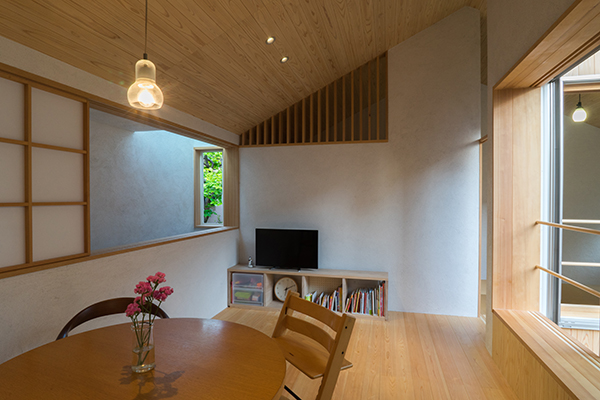 また、この敷地は北向きの旗竿地でまわりを住宅に囲まれ、南側には3階建てのマンションが立っています。1階でも自然光で過ごせるように天窓・高窓から吹き抜けを介し、光を落とすことに。下の間の明るさとともに、左官職人のコテの跡が残る砂しっくいの壁が柔らかい光で照らされ、美しい表情を見せてくれます。多摩川からの南北の通風も積極的に取り込んでいます。