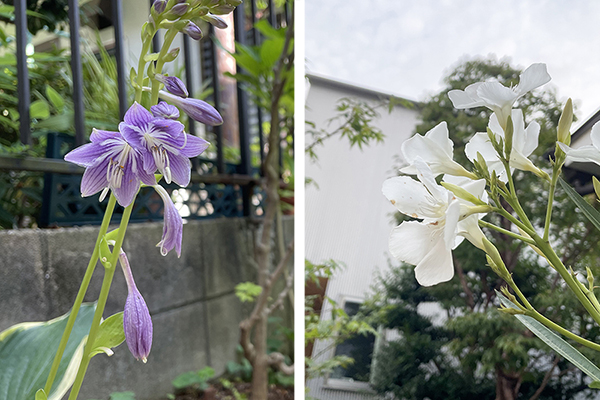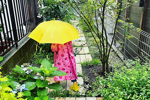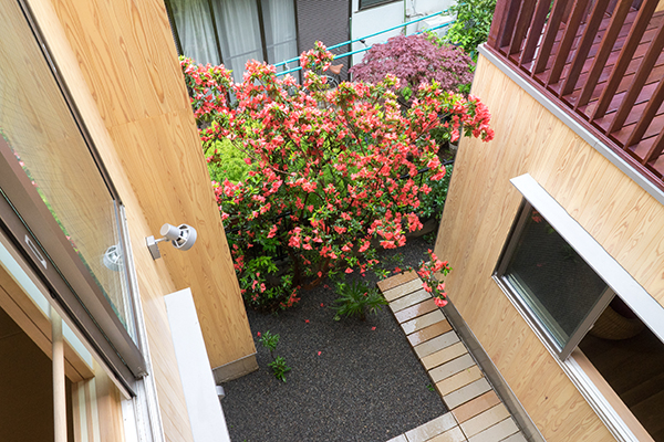 ツツジの樹のある中庭。2つのテラスにより、年中利用できる。