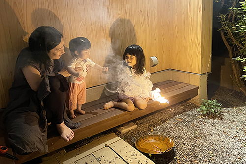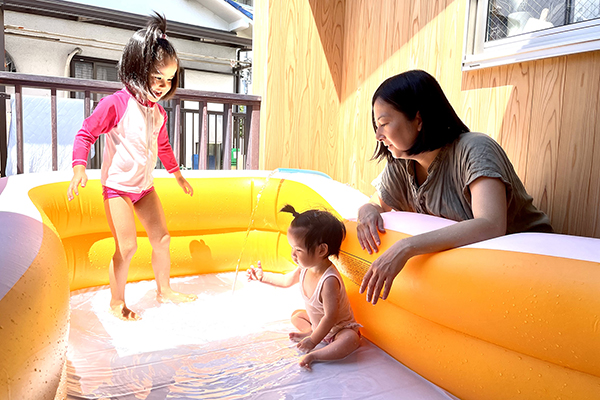 子どもも使いやすいようL型で段差を設けた下のテラス。