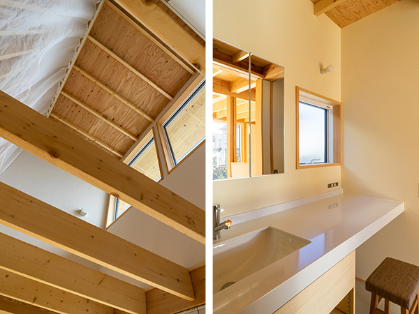 左:吹き抜けの見上げ 右:造作のシンプルな洗面カウンター