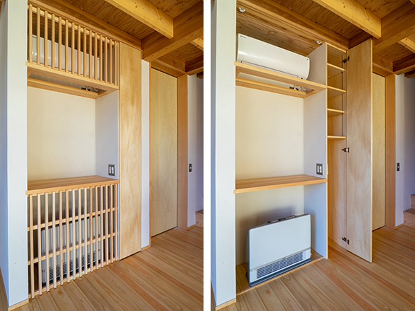 飾り棚と合わせて、収納や冷暖房機器を計画した。